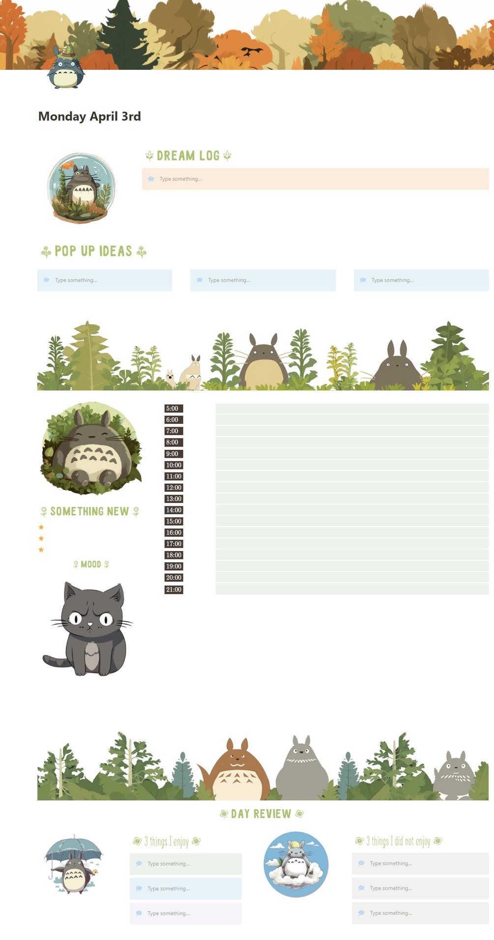 Notion template is a bullet journal with a Totoro theme. Totoro is a beloved character from the Studio Ghibli film "My Neighbor Totoro." The template likely includes various sections for daily, weekly, and monthly planning, as well as pages for habit tracking, goal setting, and reflection. The Totoro theme may be reflected in the design elements of the template, such as the use of Totoro illustrations, colors, and fonts. This template may appeal to fans of Totoro who are looking for a creative and organized way to plan their days and track their progress towards their goals.